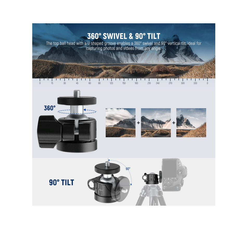 El cabezal de bola superior con ranura en forma de U permite rotación completa de 360° e inclinación vertical de 90°, facilitando capturas desde cualquier ángulo. Perfecto para fotografía, video, vlogging y creación de contenido.