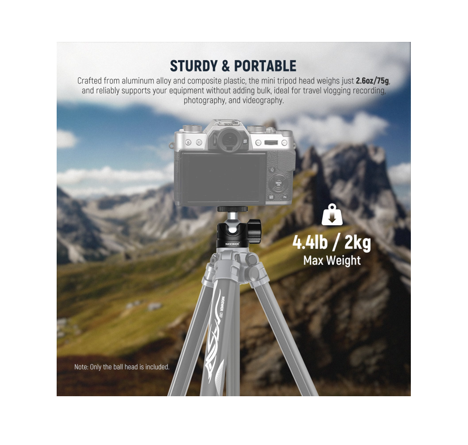 Fabricado en aleación de aluminio y plástico compuesto, este mini cabezal pesa solo 75 g, ofreciendo soporte confiable sin añadir volumen. Ideal para viajes, vlogging y grabaciones móviles.