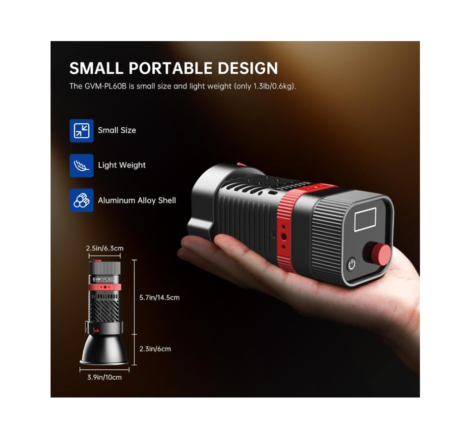 Construida con una carcasa de aleación de aluminio, esta luz pesa solo 1.3 lb (≈590 g) y mide 5.5 x 3 x 2.5 pulgadas. Es ideal para iluminación en bodas al aire libre, grabación de video, fotografía, entrevistas, YouTube, TikTok, filmación, transmisiones en vivo y producción en estudio. Su diseño tipo linterna facilita llevarla a cualquier lugar para lograr la iluminación perfecta.