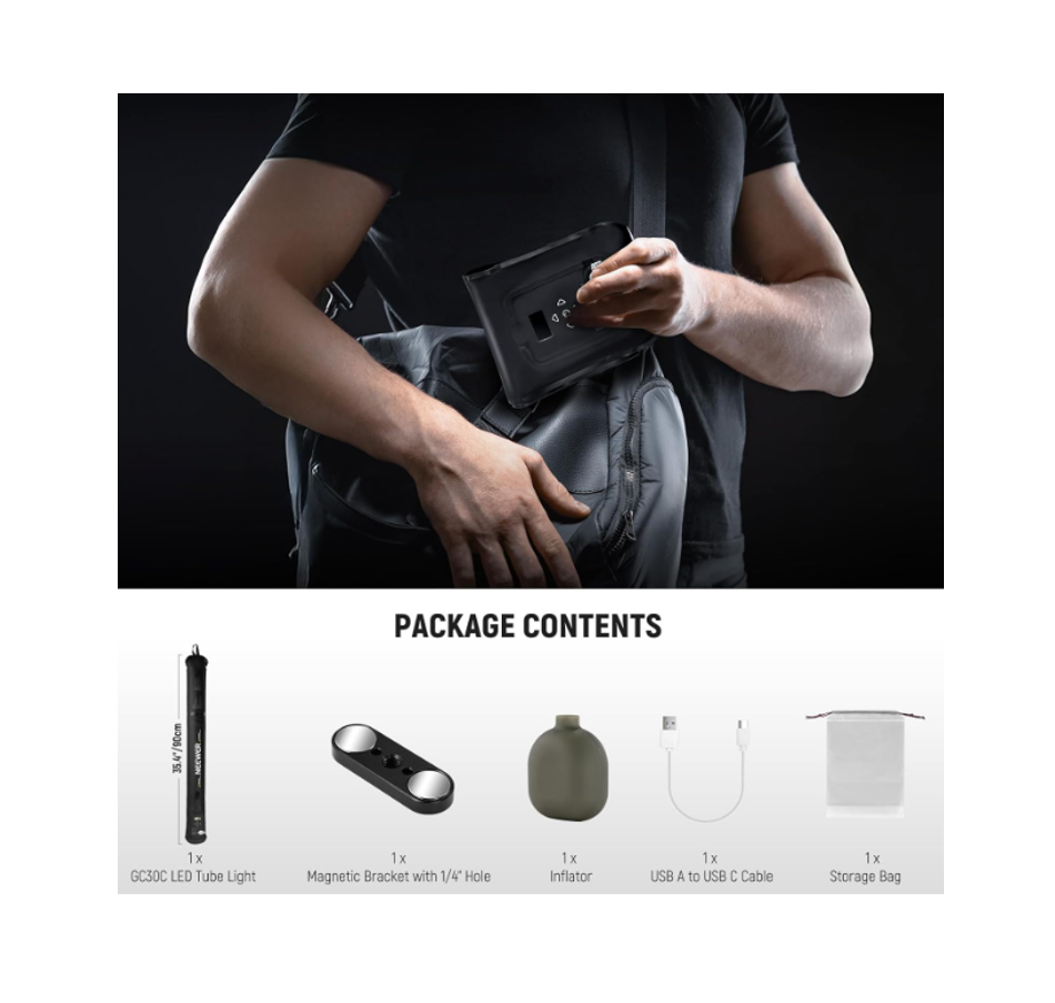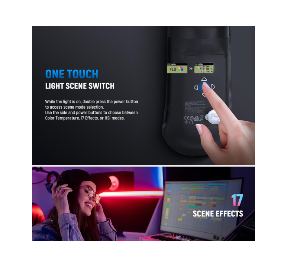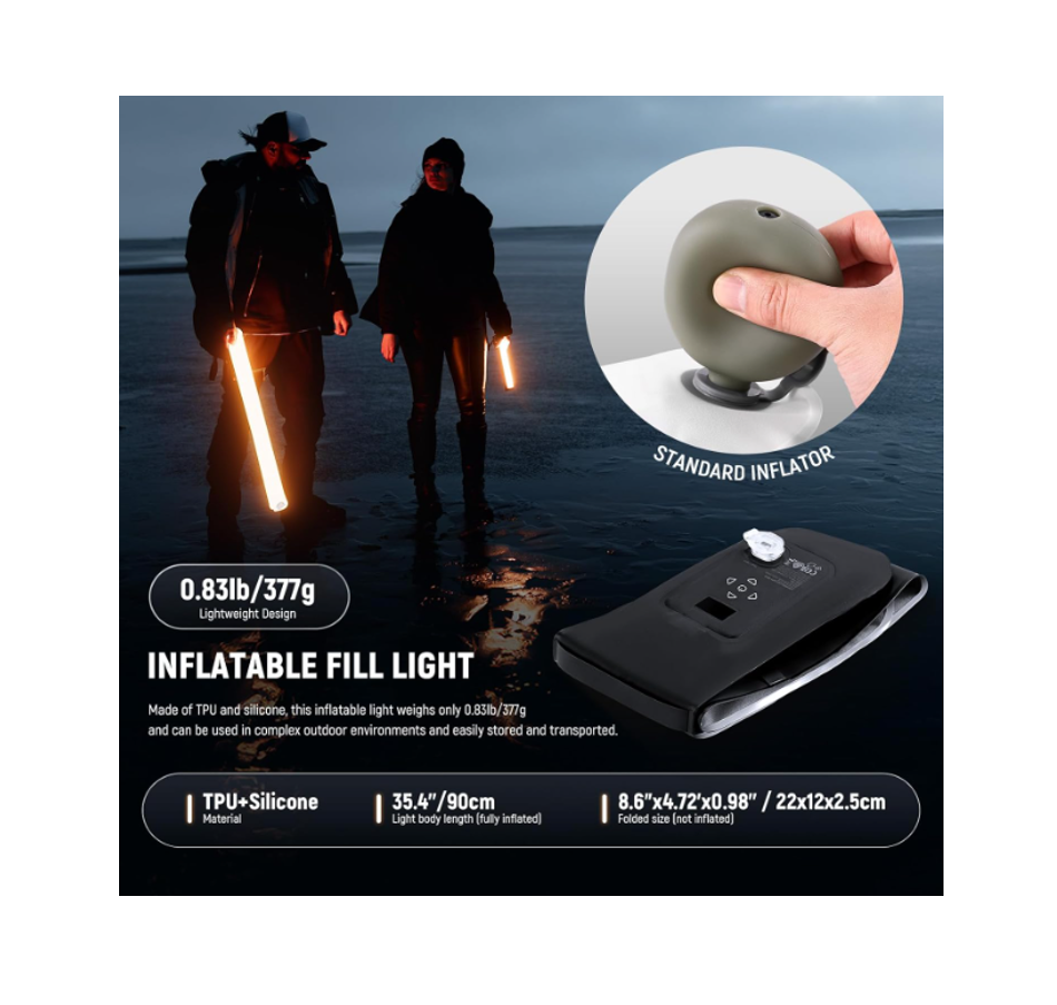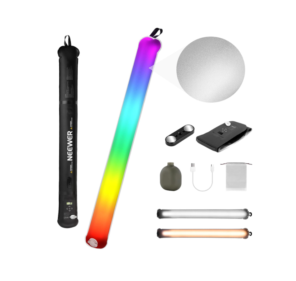 Varita de luz LED RGB portátil e inflable, ideal para fotografía, video, vlogs y contenido creativo. Ligera, compacta y con iluminación potente de 30W.