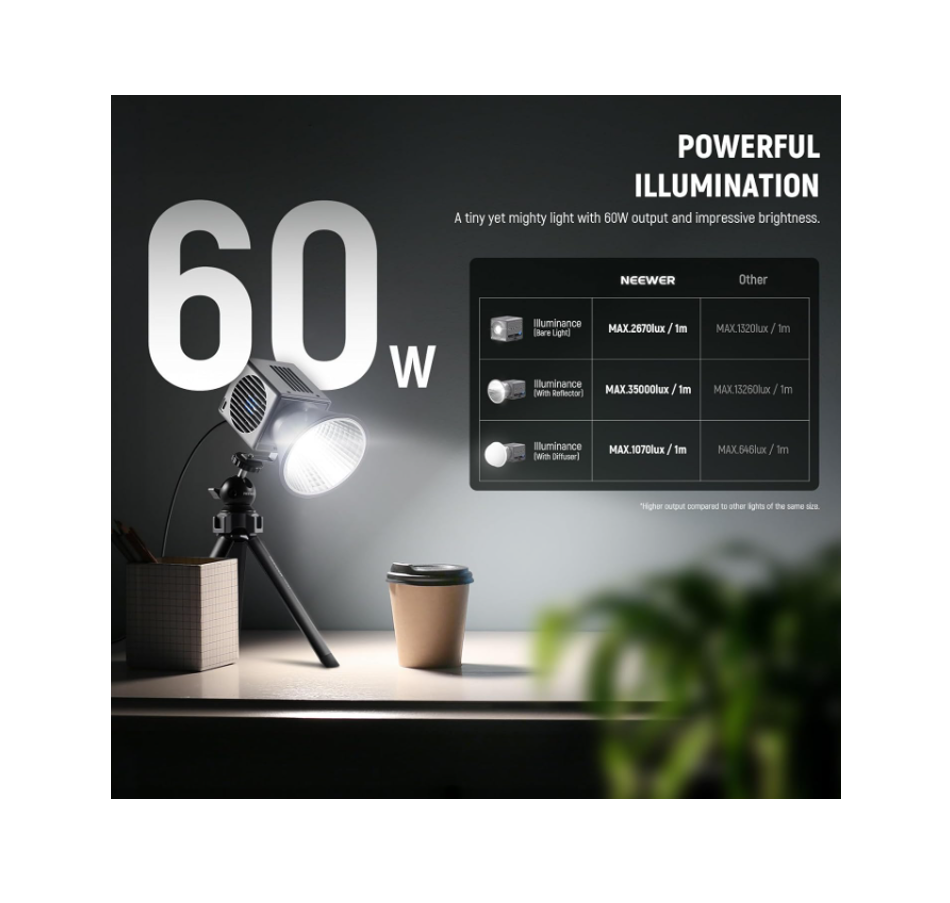 Potencia de 60W con hasta 35,000 lux a 1 metro (3.3 ft) usando el reflector estándar.