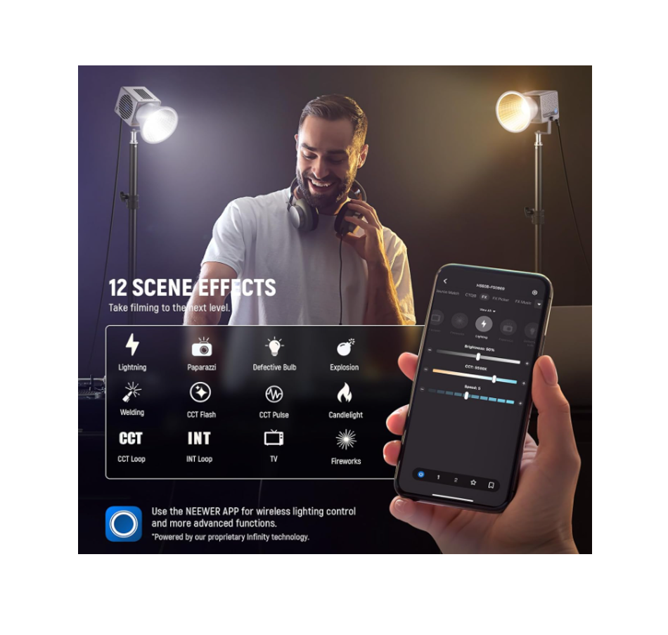 Control remoto con la app NEEWER vía Bluetooth, que permite agrupar luces, desbloquear más efectos.