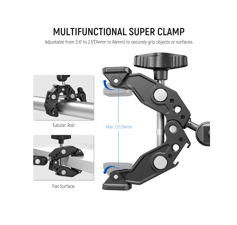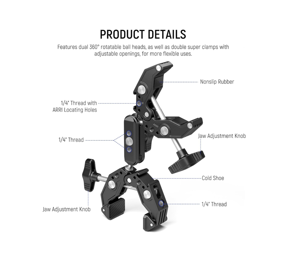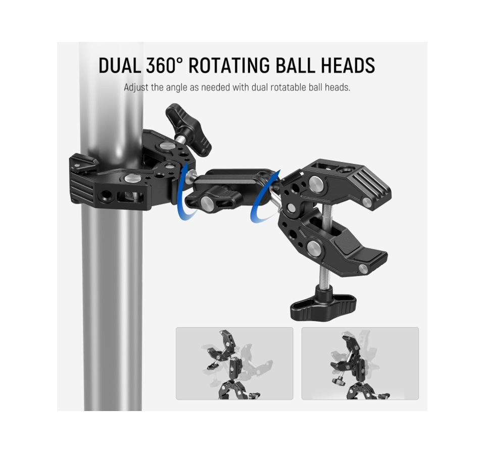Brazo mágico profesional con doble abrazadera, diseñado para montar cámaras y accesorios de forma estable, flexible y segura en escritorios, postes, soportes de luz, barras transversales, motocicletas, bicicletas y más. Una solución compacta y versátil para fotografía y video.
