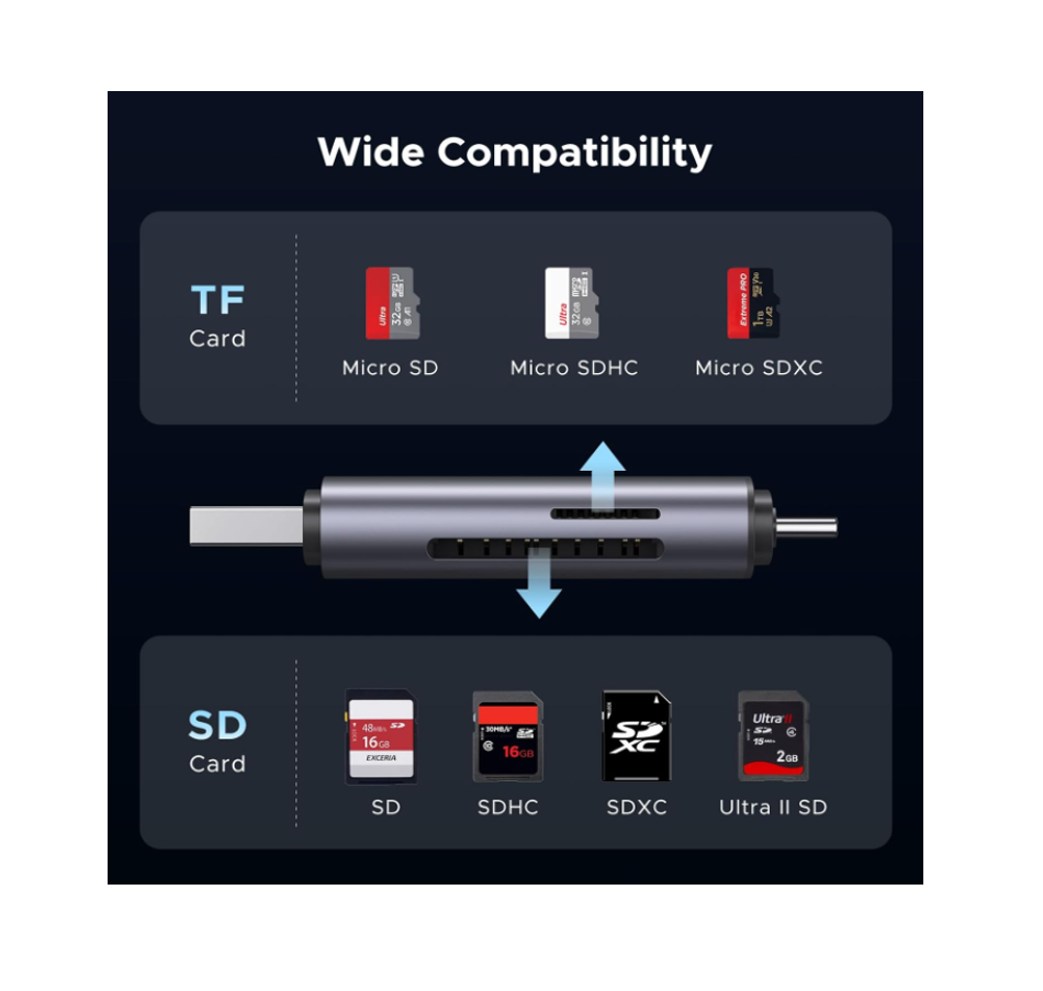 Ofrece doble ranura, permitiendo leer tarjetas SD y microSD simultáneamente, lo que mejora la eficiencia y evita conectar y desconectar repetidamente.