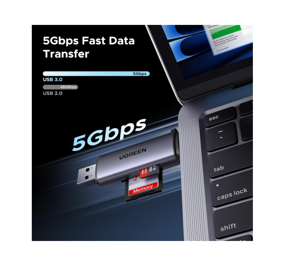 El lector de tarjetas UGREEN USB-C / USB-A 2 en 1 permite transferencias rápidas y eficientes gracias a la tecnología USB 3.0 SuperSpeed, alcanzando velocidades de hasta 5 Gbps, ideal para fotos de alta resolución, video 4K y archivos de gran tamaño.