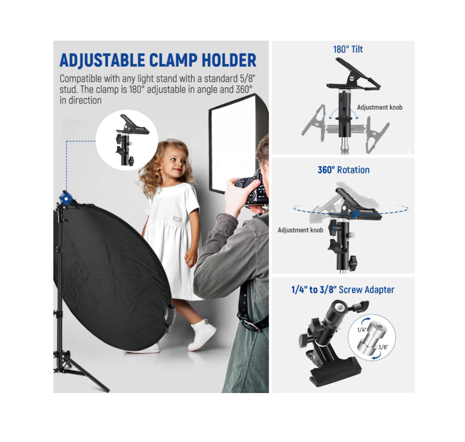 Además, se suministra una abrazadera para reflector con montaje para soporte y un adaptador roscado hembra 1/4”-20 a hembra 3/8”-16. El reflector de nylon es plegable y se guarda fácilmente en la bolsa incluida.
