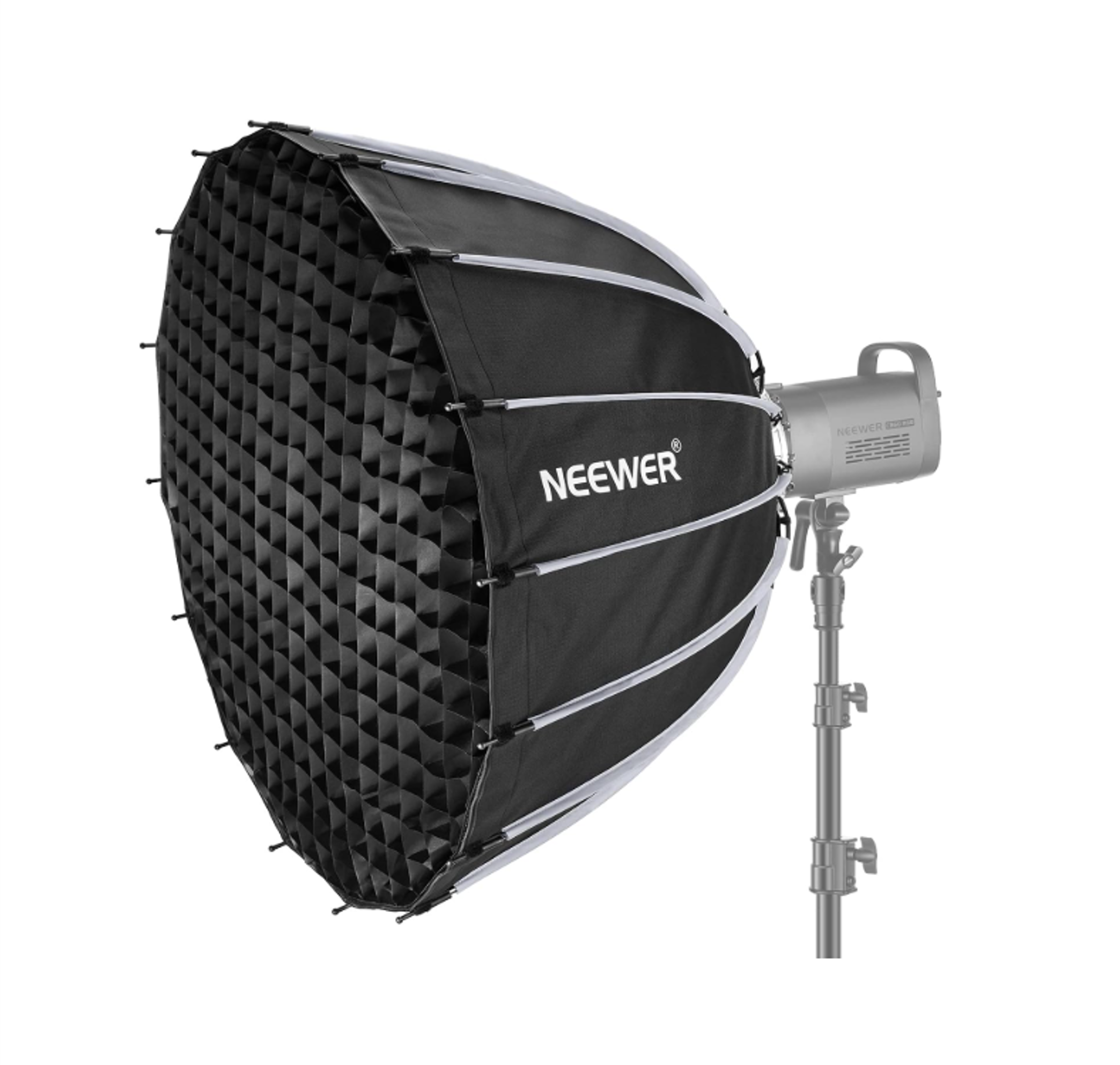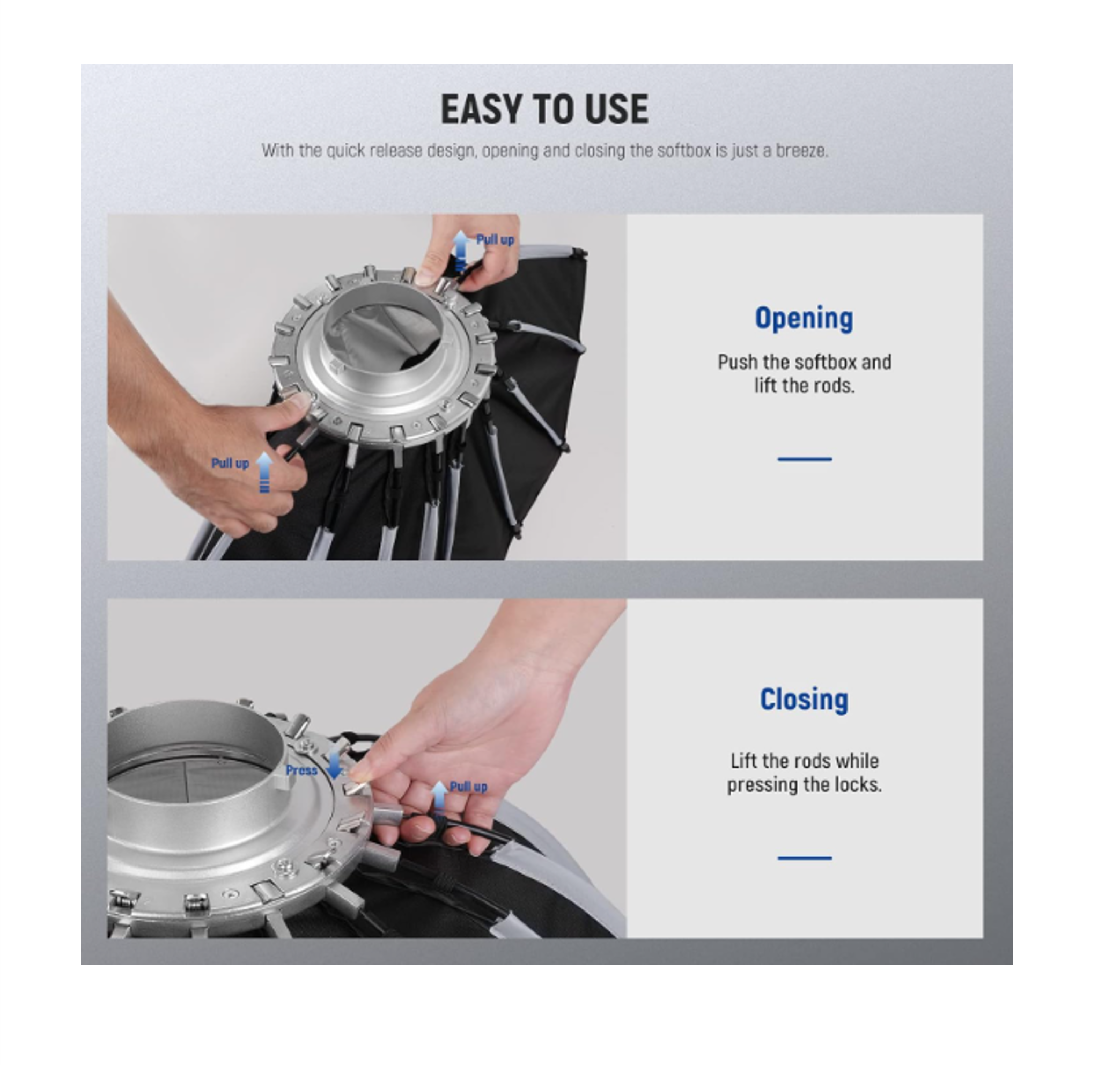 【Estructura de liberación rápida y plegado rápido】Las 16 varillas altamente resistentes le dan a esta caja de luz una durabilidad incomparable y una forma parabólica impecable que puede soportar decenas de miles de prensas sin deformación durante años de uso. El diseño de liberación rápida te permite configurar la softbox en menos de 15 segundos sin ninguna herramienta. Plegable y solo 3.3 libras (3.3 lbs) de peso, la caja de luz es fácil de almacenar y transportar dentro de la bolsa de transporte incluida