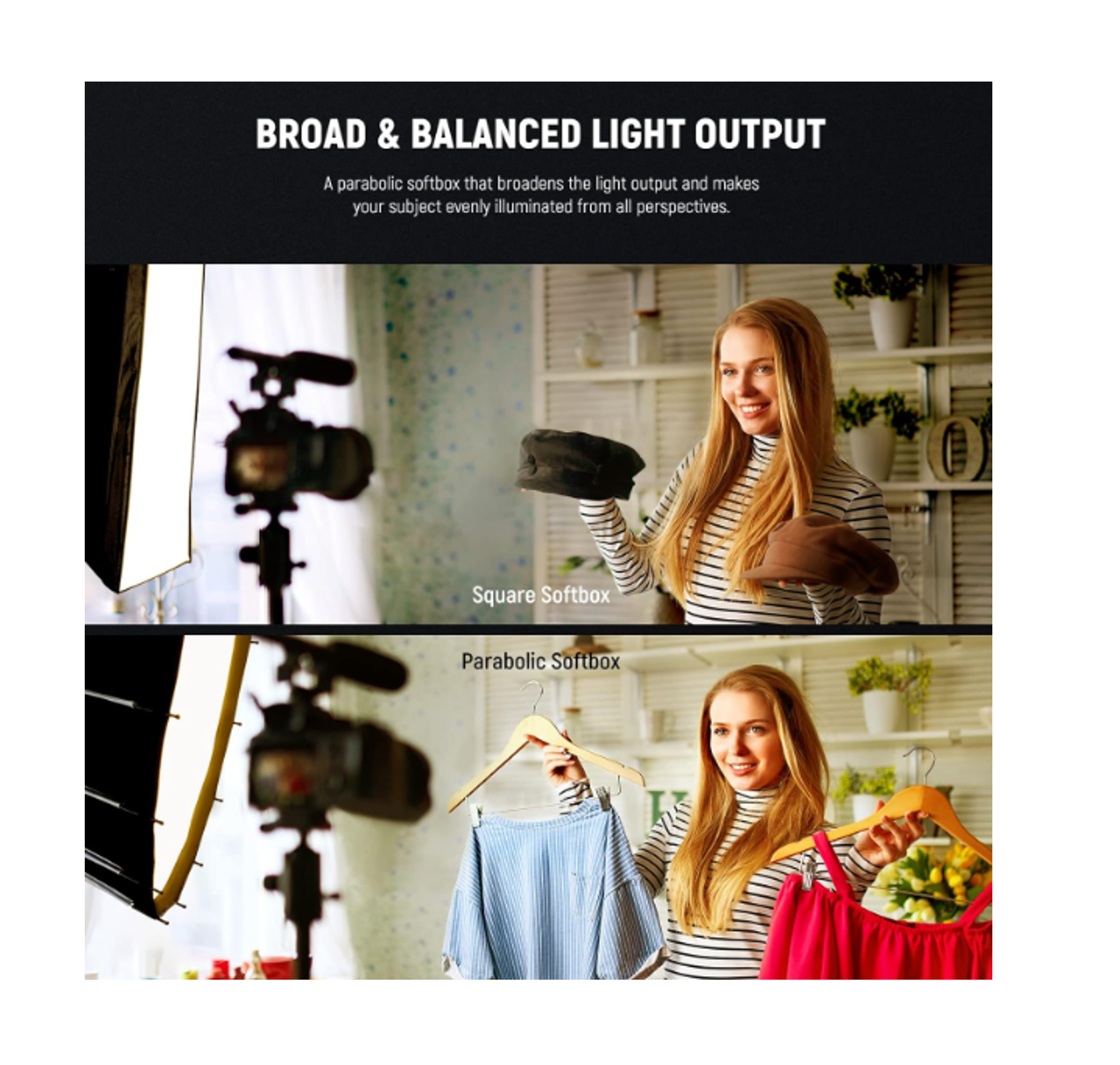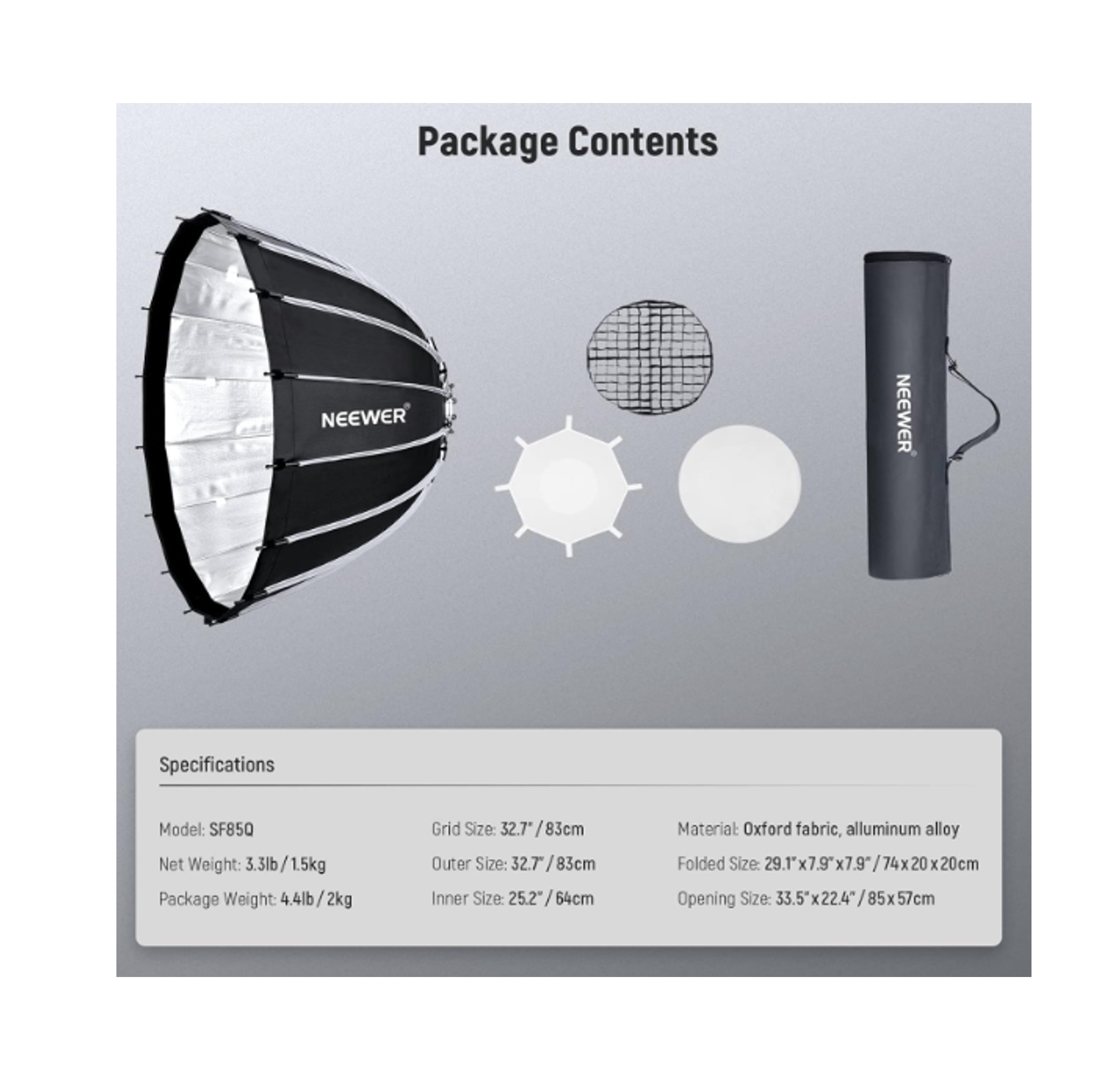 【Caja de luz parabólica hexadecágona】Esta caja de luz parabólica profunda cuenta con un revestimiento interno suave y uniforme plateado que amplía y difunde la salida mientras mantiene el índice de reproducción de color neutro (CRI) y la temperatura, difundiendo la luz de manera más uniforme y amplia para mejorar los resultados de disparo. Se pueden fijar dos capas de difusores a través de cierres táctiles para suavizar el deslumbramiento duro y eliminar sombras no deseadas