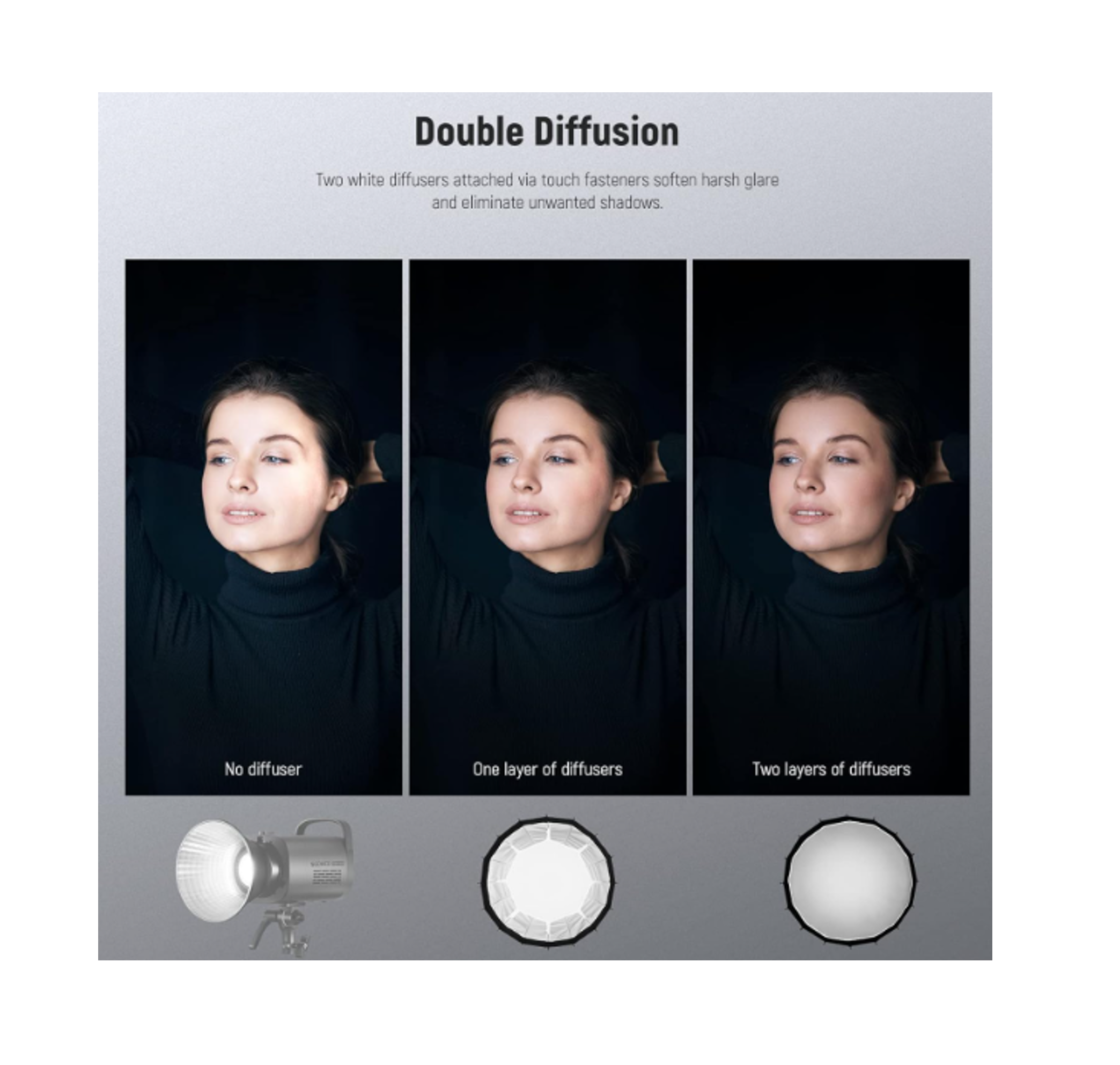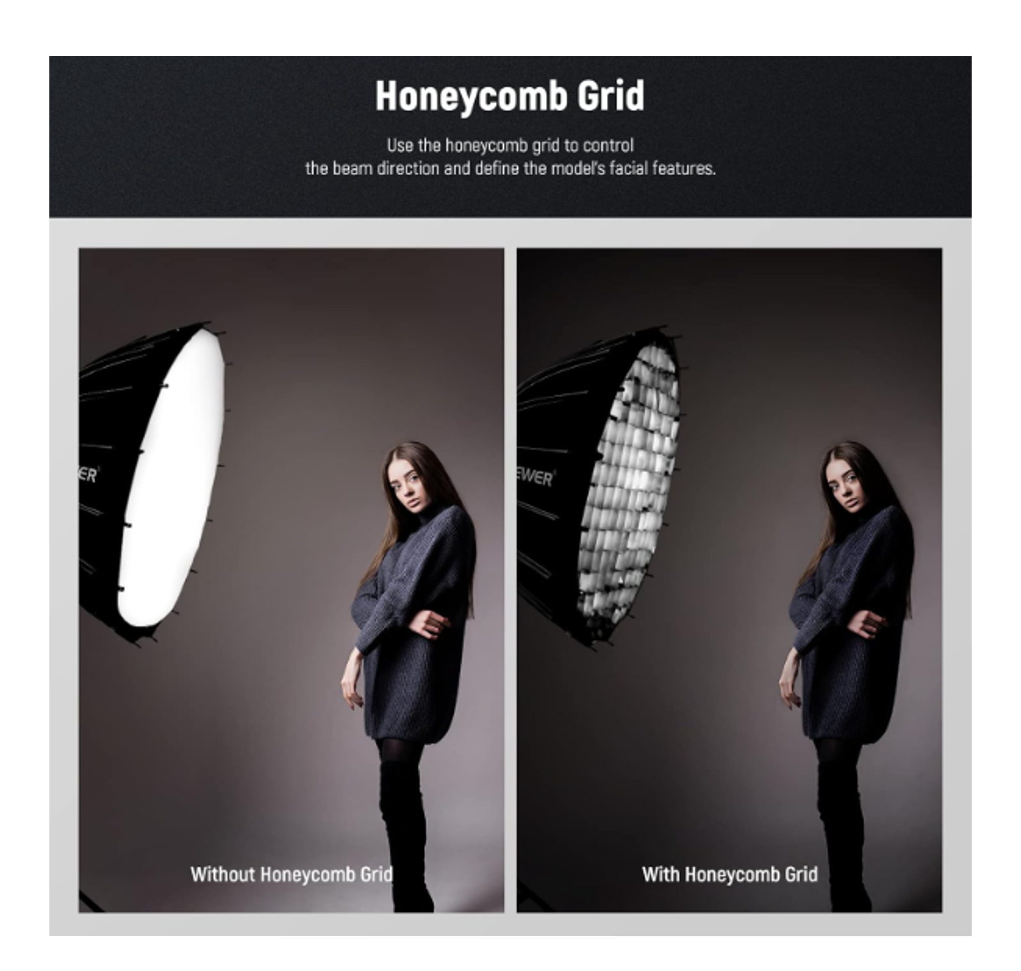 Rejilla y difusores personalizables: el uso de la rejilla de panal puede hacer que la forma de la luz sea más confinada y direccional, lo que permite que el ángulo del haz se concentre a 45°, lo que da a los fotógrafos un efecto de luz dramático y expresivo para definir la estructura facial de su modelo. Las 2 piezas de difusores de alta calidad se pueden combinar libremente en uso