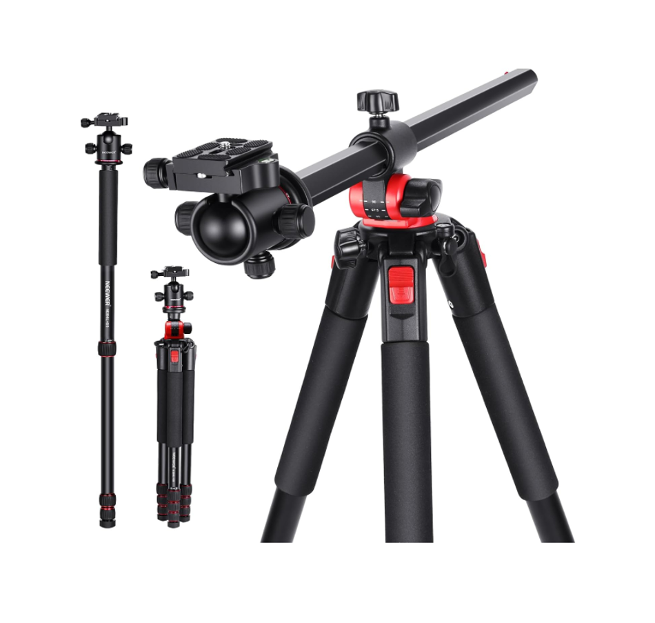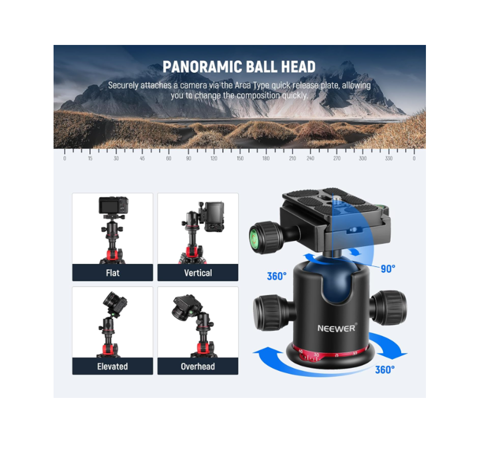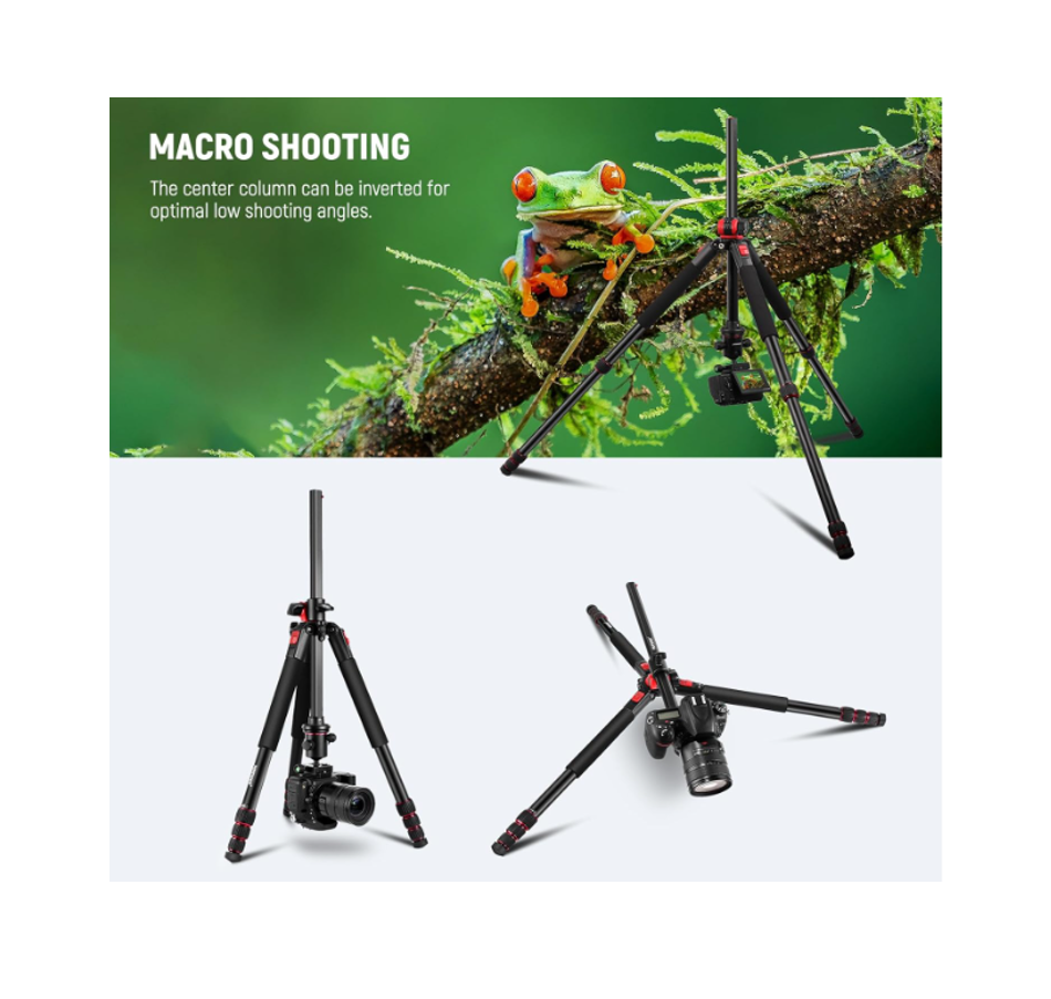 La columna central puede usarse verticalmente (0° / 22.5° / 45° / 67.5° / 90°) u horizontalmente con rotación de 360°, permitiendo realizar fácilmente fotografías panorámicas, de ángulo bajo y macro.
