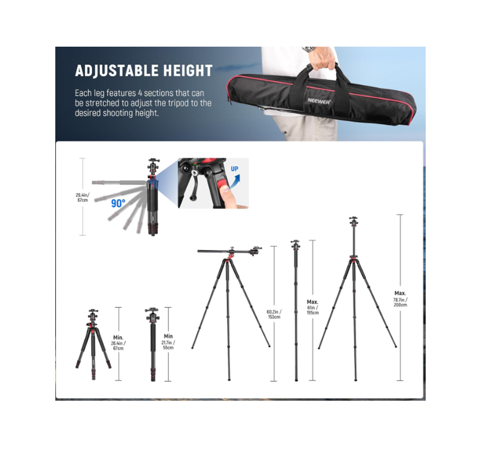 Las patas de 4 secciones con cierres de giro de liberación rápida permiten ajustar la altura desde 26.4" hasta 78.7" en segundos.