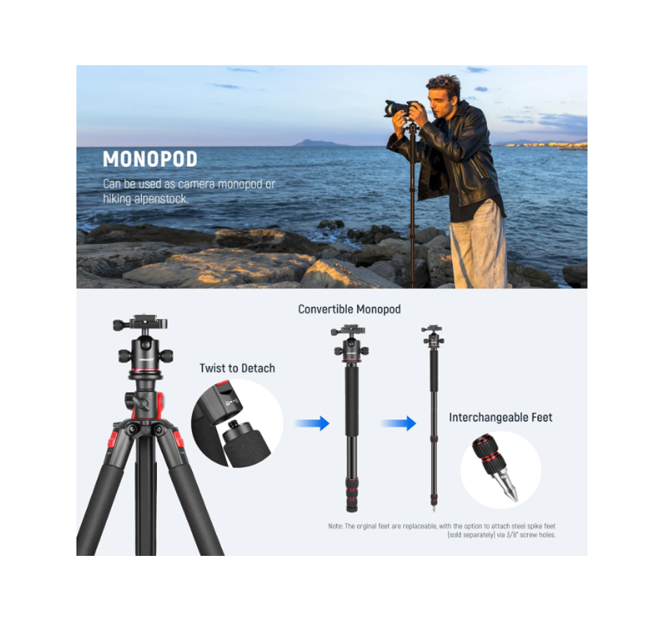 Uno de los tubos del trípode puede desmontarse y combinarse con la columna central para convertirlo en un monopie.