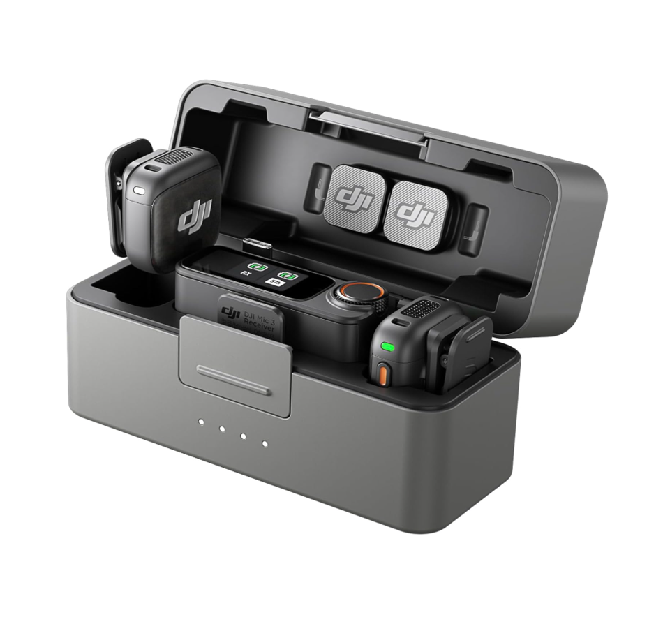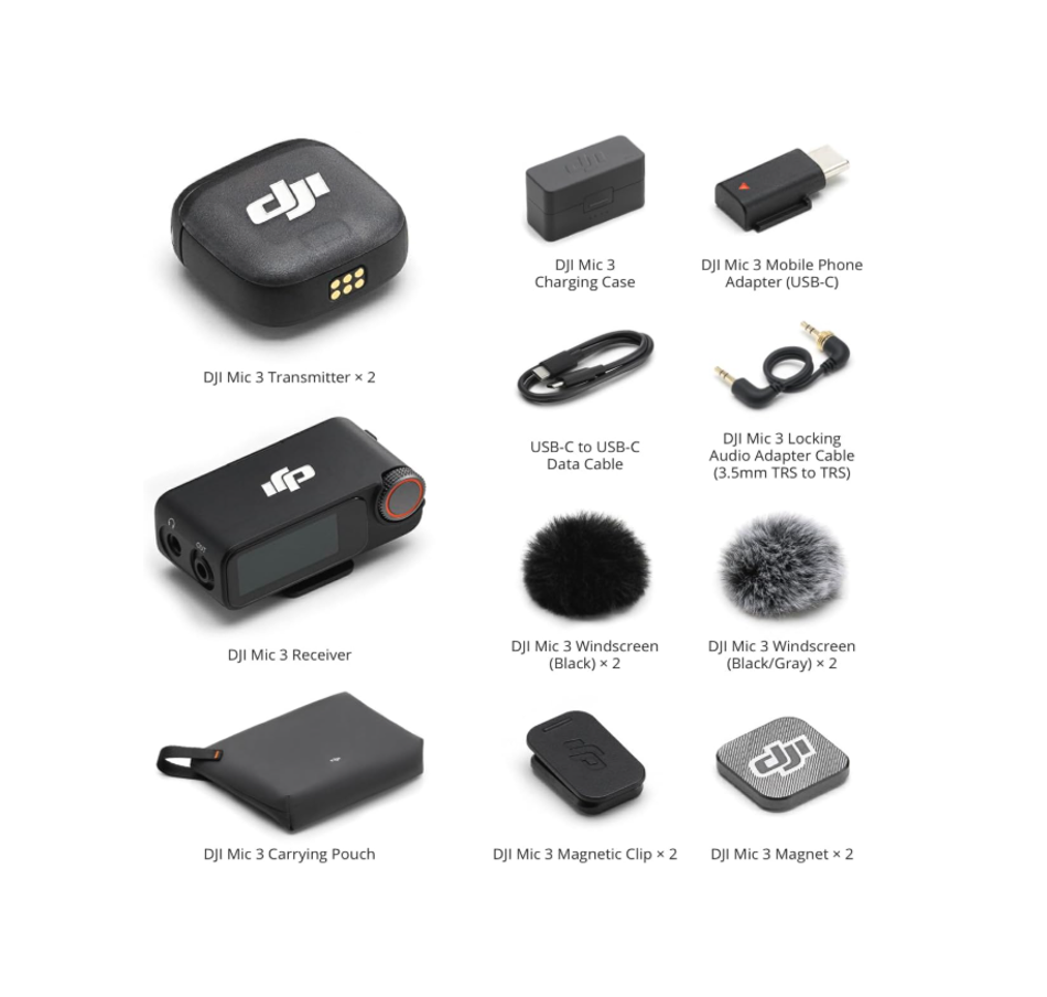 • Incluye dos DJI Mic 3 TX, un RX, un estuche de carga, un adaptador de teléfono móvil Mic 3 (USB-C) y más. Graba dos voces fácilmente y mantente alimentado hasta 28 horas de filmación.