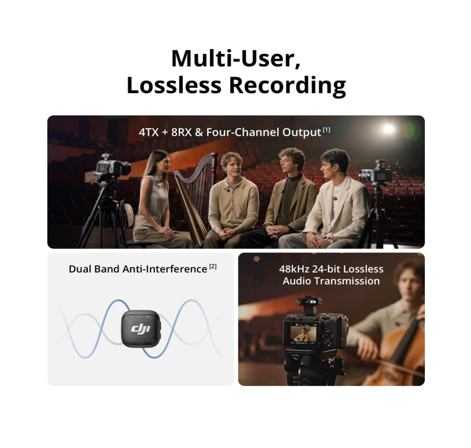 • Capacidad 4TX + 8RX y salida de cuatro canales [1] - Este receptor de micrófono lavalier puede emparejarse con 4 TX y sincronizar audio a 7 RX adicionales, ideal para podcasts o entrevistas grupales.